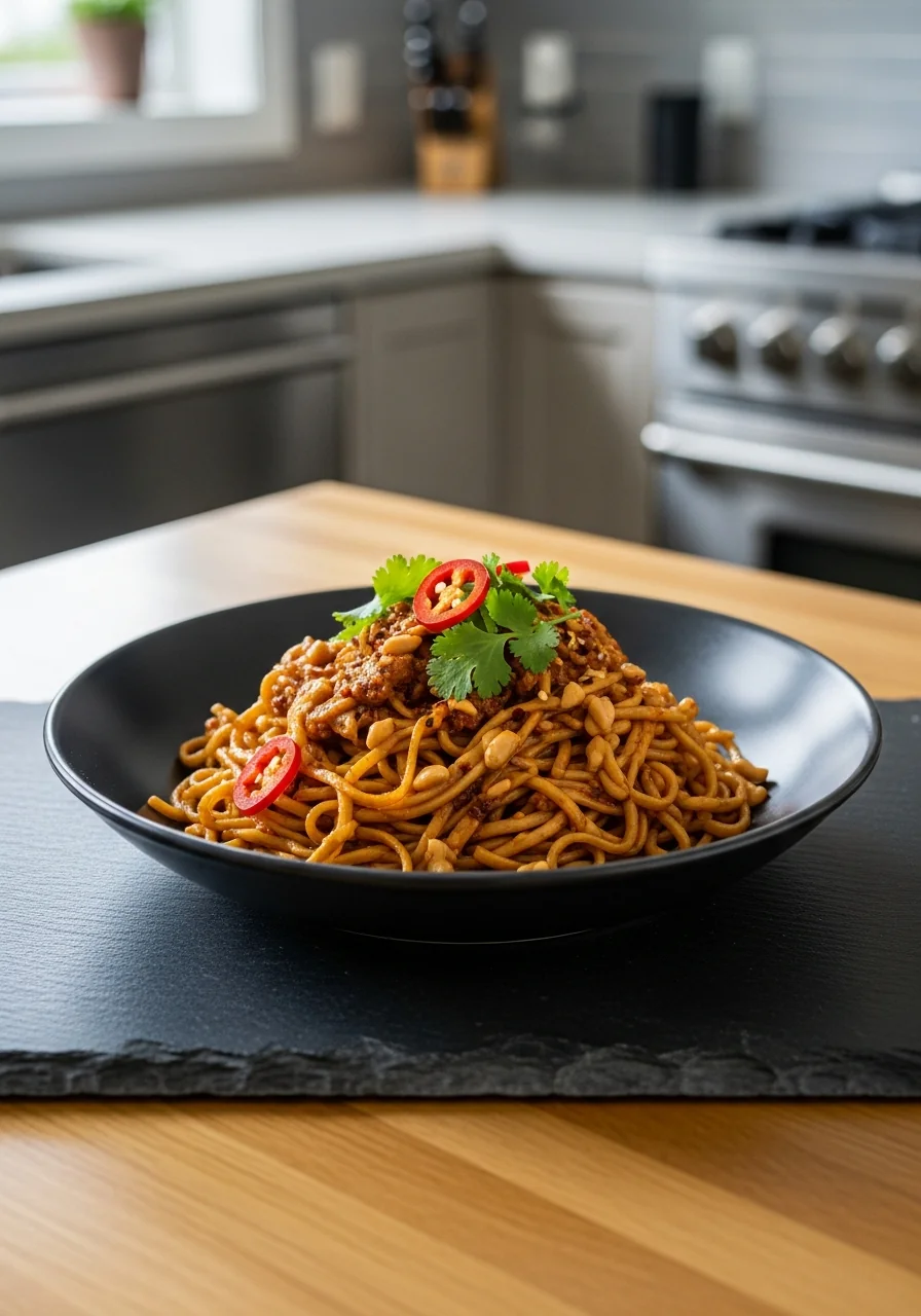 Plate the noodles, garnish with chopped peanuts, cilantro, and a pinch of red pepper flakes for extra heat.